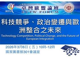 2026年第1次「臺灣歐盟論壇」主題為「科技競爭、政治變遷與歐洲整合之未來(Technology Competition, Political Change, and the Future of Eu... 2026-03-13