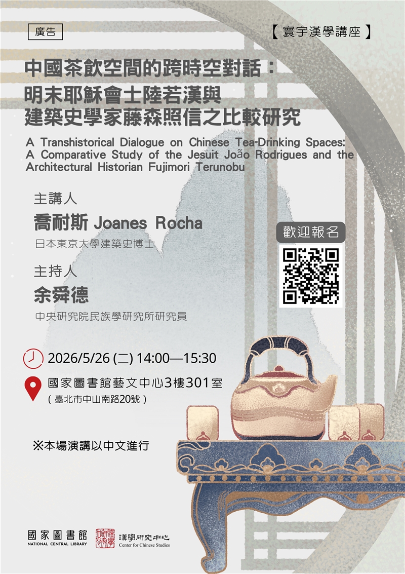 講題:中國茶飲空間的跨時空對話:明末耶穌會士陸若漢與建築史學家藤森照信之比較研究(A Transhistorical Dialogue on Chinese Tea-Drinking Spaces: A Comparative Study of the Jesuit João Rodrigues and the Architectural Historian Fujimori Terunobu)