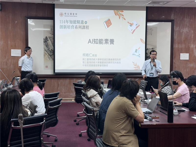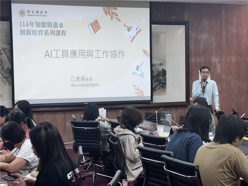 國家圖書館於今(114)年10月15日舉辦「114年知能精進與創新培育系列課程」第8場,主題涵蓋「AI知能素養」及「AI工具應用與工作協作」。本次課程邀請到國立臺灣師範大學學習資訊專業學院院長柯皓仁教授與學Bar知識學院創辦人江美燕老師主講。吸引來自雙北、桃園、新竹、臺中、苗栗、嘉義、臺南、屏東、花蓮、臺東、金門等地區公共圖書館的館員參與,並由國家圖書館翁誌聰副館長致歡迎詞,介紹講者的專業背景與專長,期盼透過課程提升圖書館同仁的專業知能及資訊素養。