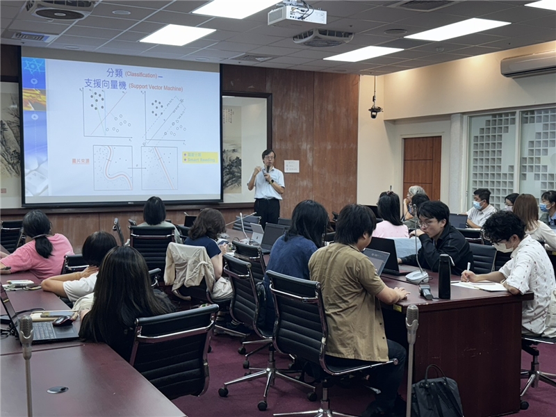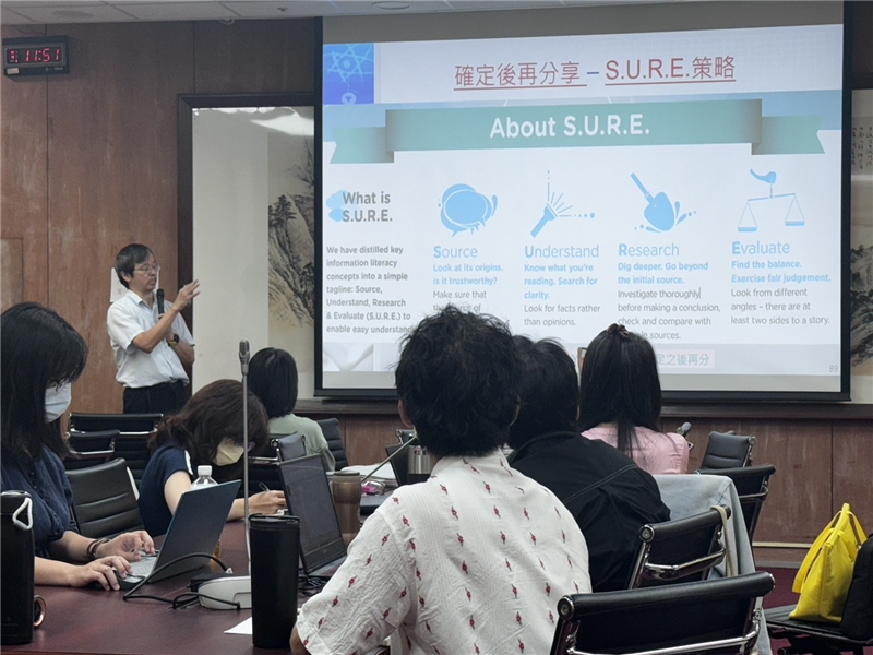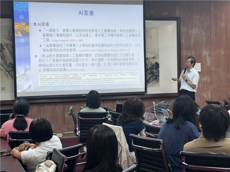 上午的課程由柯皓仁教授內容首先涵蓋人工智慧(AI)基本定義、概念與技術、生成式AI與應用,接著說明AI在教育及閱讀上的輔助功能,並帶學員瞭解運用不同工具的例子。柯老師進一步講授AI於圖書館服務的多元應用,例如館藏推薦、聊天機器人、自動分類編目、參考諮詢、排架整架等。同時亦提醒學員在導入AI時須重視倫理與關注隱私議題,探討館員應具備的AI知能。此外,也教導學員如何使用S.U.R.E.策略辨別資訊真偽與加強反思的能力。透過柯老師豐富的課程內容,培養館員AI素養與批判性思維,並可提供館員作為未來設計讀者資訊素養課程之參考。