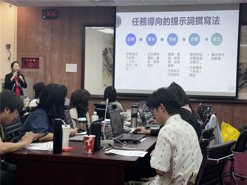 下午的課程由「學Bar知識學院」創辦人江美燕老師帶領學員探索AI時代的新工作模式,首先介紹AI工具的特色及操作方式,並教導學員運用提示詞等方式輔助工作,進而提升效率,接著江老師進一步為學員示範利用Google NotebookLM建立筆記及音檔摘要產生等功能,並利用Chat GPT及Gemini工具整理會議紀錄、建立個人專屬助理及用自然語言與AI共創設計小程式。透過深入瞭解多元工具及範例練習,學員紛紛表示受益良多,能夠運用在日後的實務工作。今日的課程兼具理論指導與實作練習,培育館員專業知能及資訊科技應用能力,為「114年知能精進與創新培育系列課程」畫下完美句點。