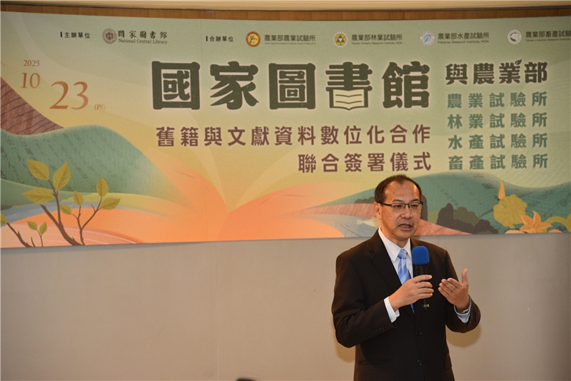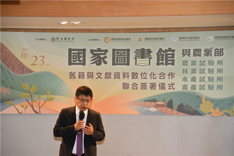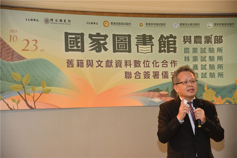 國家圖書館於本(114)年10月23日(星期四)上午在1樓簡報室與農業試驗所、林業試驗所、水產試驗所及畜產試驗所共同舉辦「舊籍與文獻資料數位化合作」聯合簽署儀式。此次合作象徵臺灣農業文化的永續傳承,也為各試驗所累積超過百年的知識資產注入新生命。