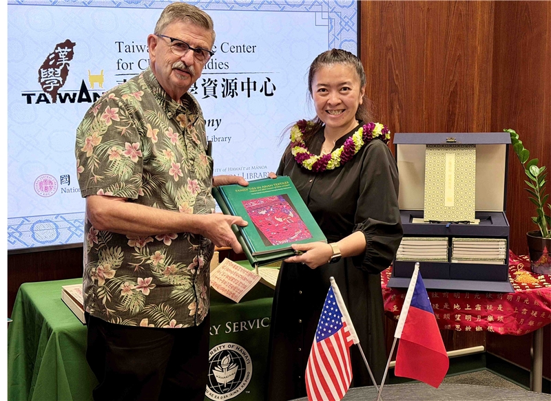 王涵青館長在致詞特別強調,夏威夷與臺灣的地理條件相似,都位於環太平洋地緣中樞位置,匯聚豐富的多元文化。而且從1920年代開始,夏威夷大學也培養美國無數漢學研究學者,譬如將畢生藏書捐贈國圖的史丹佛大學Albert E. Dien丁愛博教授在1960-1961年就是在這裡開始教學生涯。而夏威夷大學學術出版漢學與東亞研究成果,也經常引領臺灣學術界認識世界前瞻性的人文研究風貌。因此,國圖未來也將持續為UHM提供優質學術資源,提升臺灣學術研究成果的國際能見度,為亞太乃至全球漢學研究與臺灣研究的發展挹注新動能。