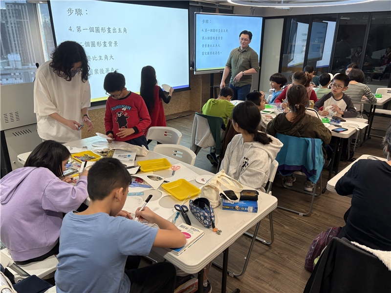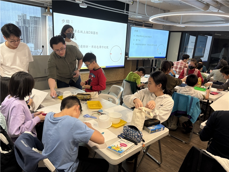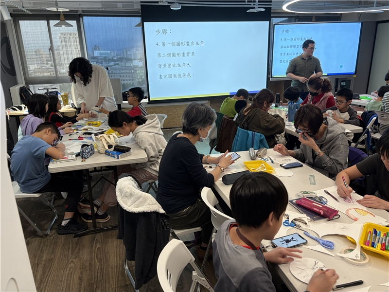 在今天的課程中,曾老師首先帶領學員一起共讀繪本,接著解說動畫形成的原理。動畫一開始是透過圓盤小孔看圖片,眼睛看到畫面後,會因為視覺暫留而產生圖片在動的錯覺,產生動畫的效果。接著放映短片,讓學員親身體驗視覺暫留。接著進入實作部分,使用剪刀、打洞器、碗、白色西卡紙、彩色筆和線等日常隨手可得素材,製作自己的動畫。學員可以在剪成圓形的紙上構圖,畫上主角和背景,製作完成後,則鼓勵他們可以使用動畫中的主角和背景說出一個故事,在短短的一堂課中習得科學知識,並在構圖及說故事的過程中結合人文與藝術教育。