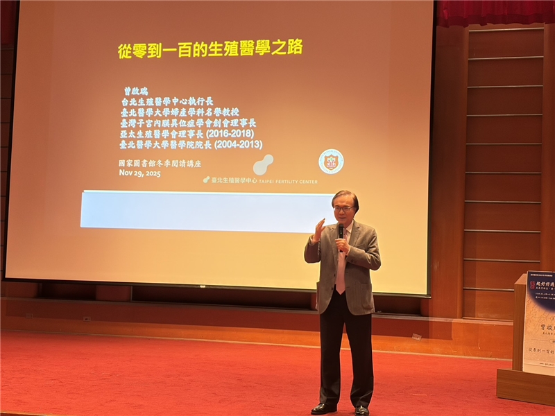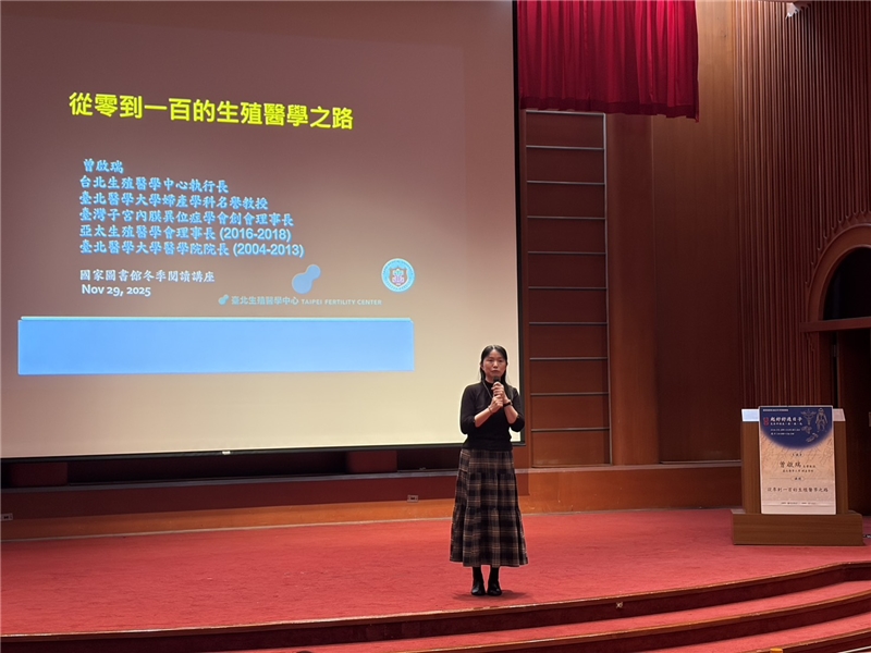 今日演講由王涵青館長擔任開場主持人,王館長首先代表國圖歡迎現場讀者,並介紹今日講師曾啟瑞醫師。曾醫師是臺灣生殖醫學的開拓者,自1985年成功創造臺灣首例試管嬰兒,至今近40年未曾離開臨床第一線,臺灣不孕症治療迅速竄起,至少增加20萬個試管寶寶。他亦於2002年達成全球首例自體粒線體轉殖懷孕案例,奠定臺灣在國際生殖醫學的地位。2012年,他榮獲全球華人生殖醫學會(The GlobalChinese Association for Reproductive Medicine, GCARM)頒發「全球華人生殖醫學終身成就獎(Lifetime Achievement Award of GCARM)」,表彰其在生殖醫學領域的卓越貢獻。2025年,再獲金孕獎「醫療奉獻終身成就獎」,肯定曾醫師在臨床實務、醫學創新與教育推動上的深遠影響。