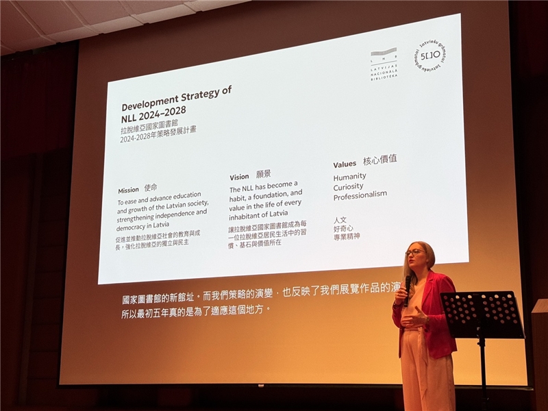 Baltiņa館長分享了拉脫維亞國家圖書館如何透過規劃設計,建立觀眾與館藏間的連結。這些策展經驗展現了圖書館的核心價值,超越單純的典藏館藏功能,並有效落實《里加宣言》閱讀的權利的精神,確保每個人都能平等、無償地獲取知識。 對該館而言,展覽不僅是館藏的陳列,更是促進社會融合與交流互動的媒介,能夠豐富民眾的閱讀與生活體驗。從拉脫維亞國家圖書館各項策展實務證明,展覽是連結館藏研究與大眾參與的戰略工具,能強化圖書館在推動國家民主發展、提升國際能見度及深化文化外交上的關鍵角色。