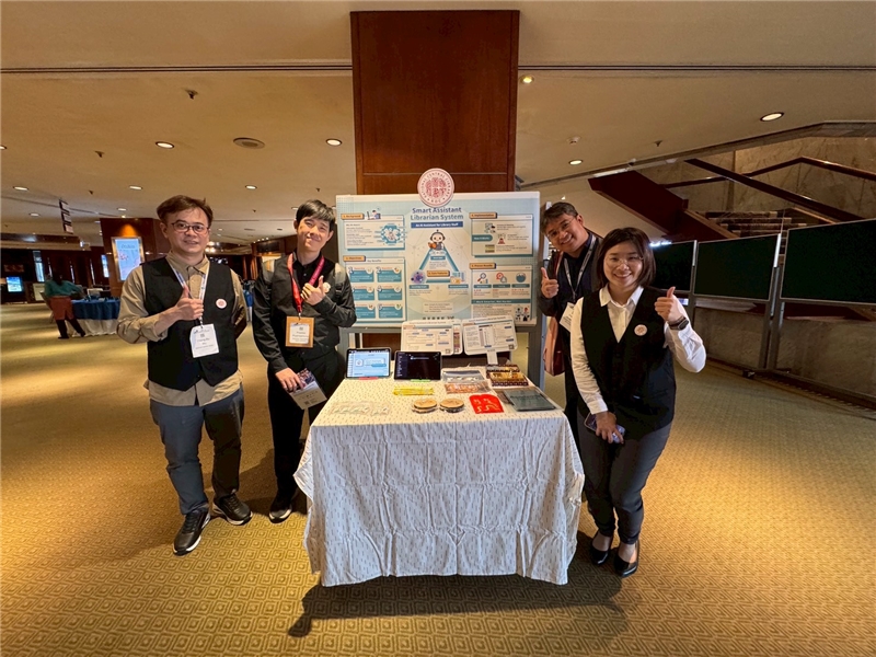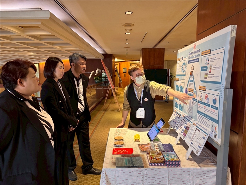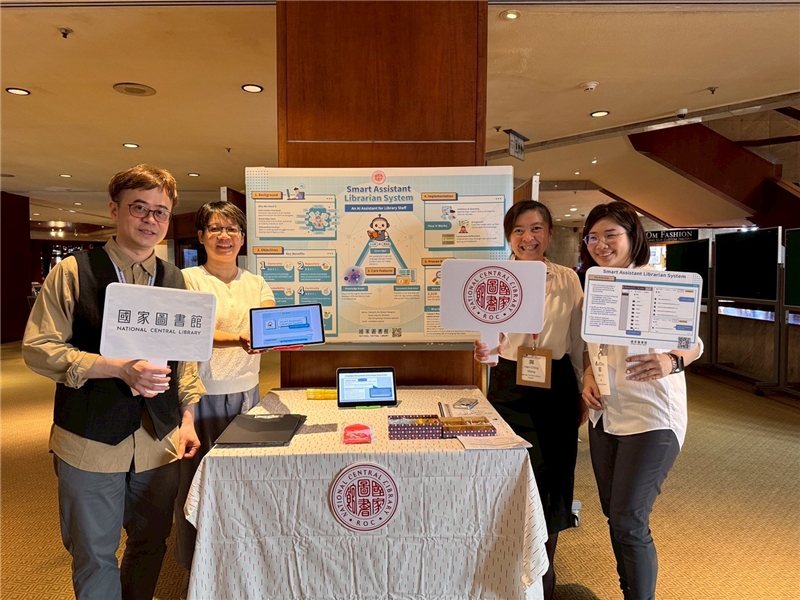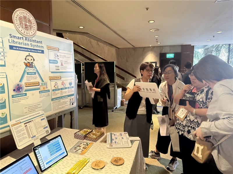 國家圖書館也於研討會中發表一篇海報,系統組以「Smart Assistant Librarian System:An AI Assistant for Library Staff」(智慧輔助館員系統:圖書館員的AI助理)為題,由王涵青館長率領系統組侯曉玲主任與吳承儒系統師發表與解說:系統以強化館內專業支持為主要目標,透過盤點與整理館內制度文件,建構可供 AI 理解與檢索的知識庫,並採用 RAG 架構提供自然語言問答服務,確保資訊可查證性。系統同時結合知識圖譜與檔案管理機制,協助館員快速掌握制度脈絡並提升日常作業效率,海報展示過程中有來自不同國家的大學及圖書館表示興趣及聽取介紹,亦提供有興趣之與會來賓掃描QRcode下載影片及簡報。