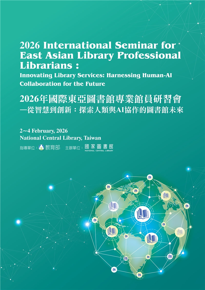 為促進我國圖書館專業與國際接軌,並行銷臺灣學術出版成果,國家圖書館將於2026年2月2日至4日舉辦「2026年國際東亞圖書館專業館員研習會」(2026 International Seminar for East Asian Library Professional Librarians)。本次研習會的主題聚焦於「人類與人工智慧協作」,邀請來自美國、英國、加拿大、日本、澳洲、瑞士、香港、菲律賓、泰國等9國的20位國際圖書館專業館員,以及國圖在海外締結的TRCCS夥伴成員館,共同齊聚臺北,開展為期三天的專業研習與交流。除了五場專題講座,與會學員還將參訪台北國際書展及國家檔案館,進一步加深對臺灣出版與文化典藏的了解。