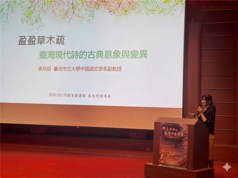 國家圖書館 2026 年春季閱讀系列講座第四場於 4 月 18 日舉行。本場講座特別邀請臺北市立大學中國語文學系余欣娟教授擔任主講,講題為「盈盈草木疏——臺灣現代詩的古典意象與變異」。