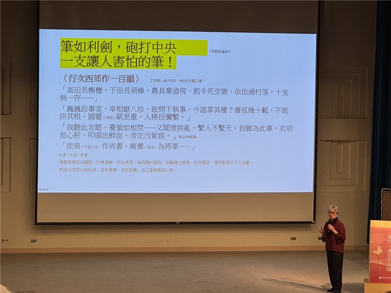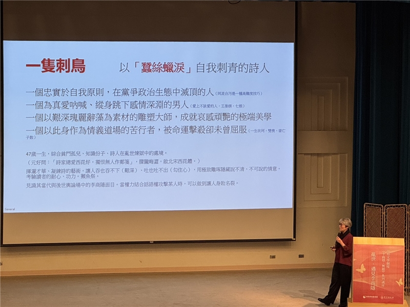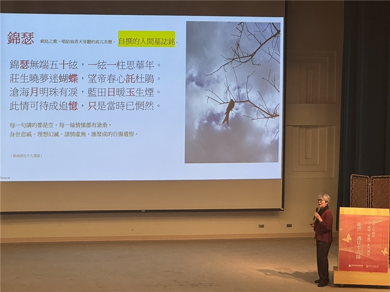 接著,簡媜老師帶領讀者細緻剖析李商隱的生命歷程與詩境意蘊,從詩作推敲性格,從性格瞭解選擇,理解命運的生成,體會其詩風之幽微與深遠。由於師承牛黨、婚入李黨,使李商隱難獲信任,仕途多舛;個性多情重義、對妻愛永不渝,妻逝後以多首詩作抒寫哀思與懷念。講座中簡媜老師深入解讀〈無題〉、〈初食筍呈座中〉、〈柳枝〉、〈春游〉、〈行次西郊作一百韻〉、〈寄惱韓同年〉、〈荊門西下〉、〈房中曲〉等作品,層層展開詩人幽隱、複雜的內心世界。