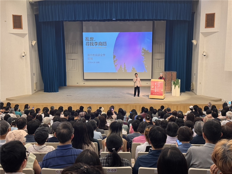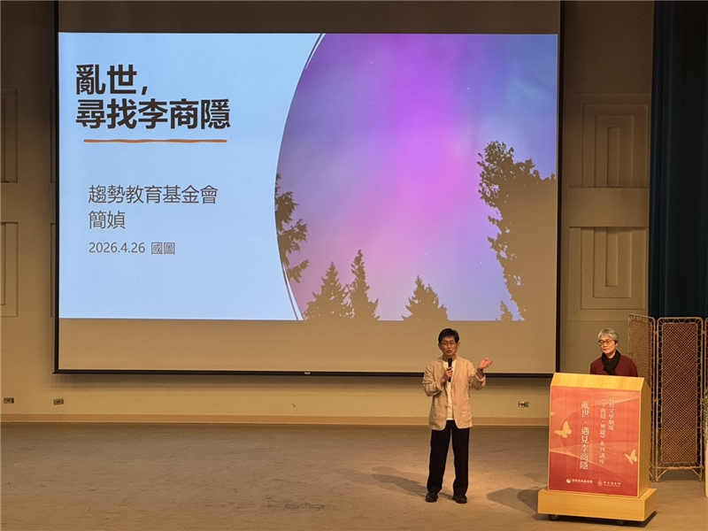 國家圖書館與趨勢教育基金會合辦之《李商隱・無題》系列講座,第2場於本(115)年4月26日(星期日)下午於本館多功能展演廳舉行,由知名作家簡媜老師以「亂世,遇見李商隱」為題進行演講,帶領讀者乘坐時光機,深入瞭解晚唐詩人李商隱一生的際遇,並由陳義芝教授擔任開場引言。