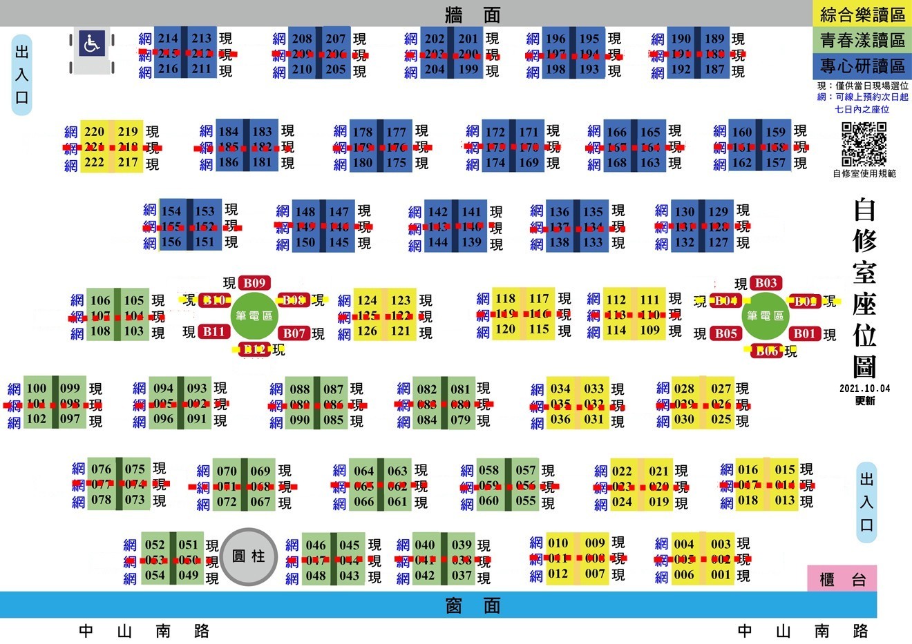本館自修室自10/5(二)起,調整座位席次為155席(含無障礙座位席次1席)。各區開放座位圖請參閱附圖。自修室線上預約、即時座位資訊及使用說明可連結下列網址檢視:https://sr.ncl.edu.tw/deskbook/booking/index.jsp。