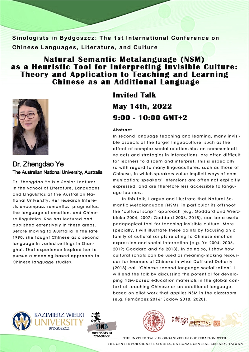 本館漢學研究中心與波蘭比得哥什卡基米日維爾基大學 (Casimir the Great University in Bydgoszcz, Poland) 語言學院合辦中臺文學、文化暨藝術系列線上講座第二、第三場次將於2022 年5 月13-14 日於「比得哥什漢學家學術會議:第一屆漢語語言學、華語語系文學暨華人文化國際研討會(SinB-2022)」舉行。