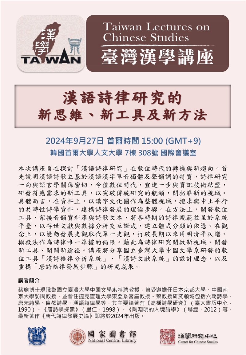 國家圖書館將於9月27日與「臺灣漢學資源中心(TRCCS)」夥伴韓國首爾大學(Seoul National University)合作,共同辦理「臺灣漢學講座」講座,邀請蔡瑜博士擔任主講,講題為「漢語詩律研究的新思維、新工具及新方法」。