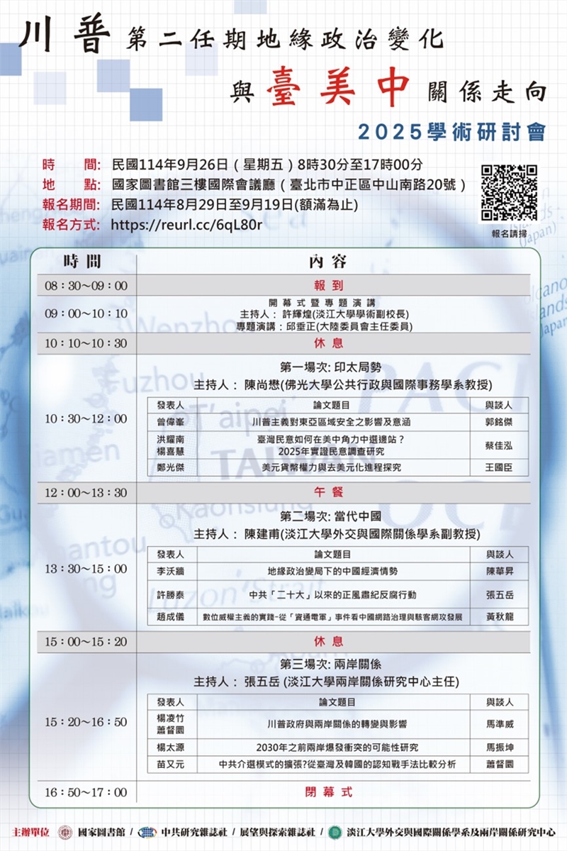 今(2025)年1月20日,美國總統川普(Donald Trump)重返白宮,已使美國外交與安全政策展現新的走向,特別是在美中戰略競爭持續、臺海局勢升溫及印太安全格局快速演變背景下,臺灣所處的國際環境更顯複雜嚴峻。為此,國家圖書館、中共研究雜誌社、展望與探索雜誌社、淡江大學外交與國際關係學系及兩岸關係研究中心,特於9月26日(星期五)共同舉辦「川普第二任期地緣政治變化與臺美中關係走向」學術研討會,邀請相關領域知名學者專家,共同探討川普政府可能的外交走向,並深入分析臺美關係發展、美中互動新態勢及其對臺灣戰略地位影響,期藉由多面向對話與交流,提升社會各界對國際政經動態的了解,盼能提供政策前瞻思維,協助臺灣在地緣政治變局中尋找最佳因應之道。歡迎關心國際局勢、兩岸關係與臺灣未來發展的各界人士踴躍參加。報名方式如下。