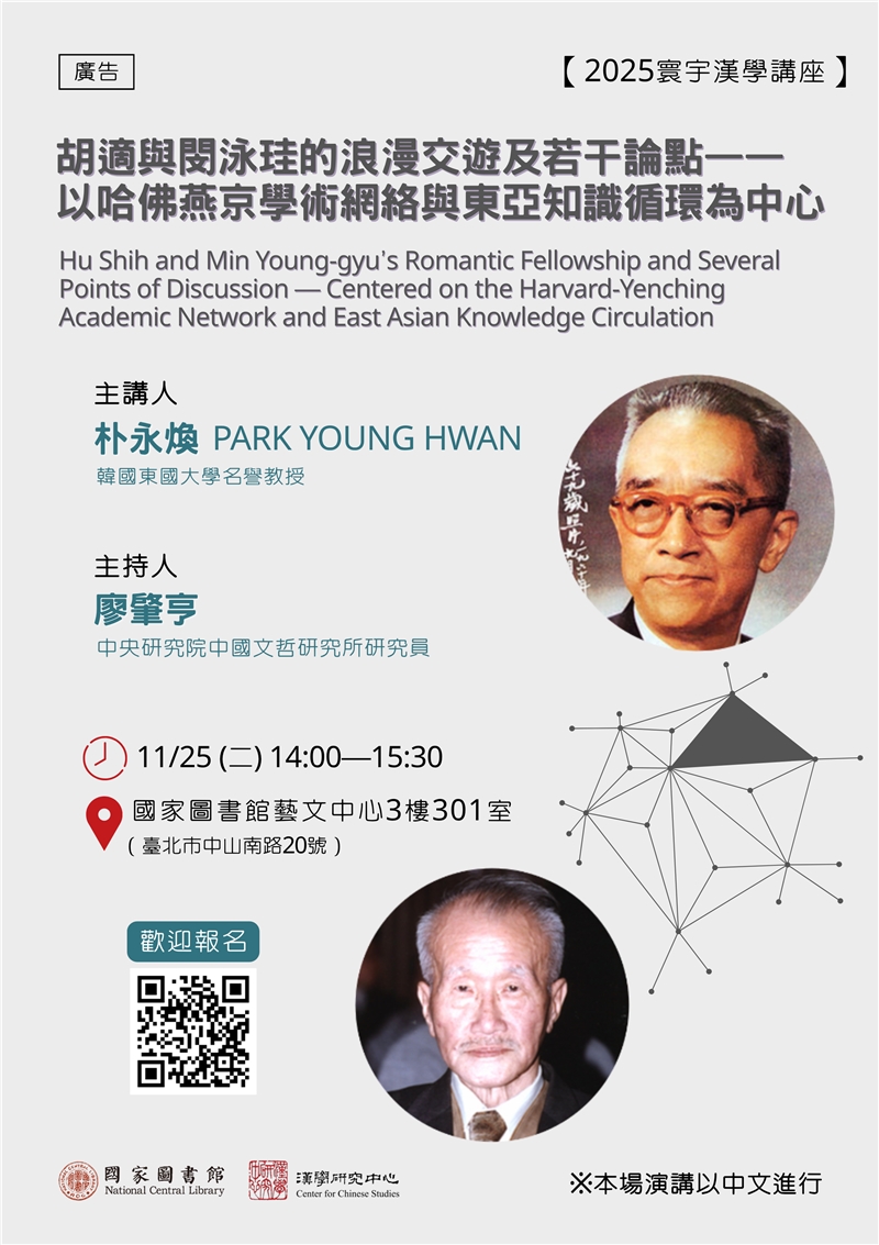 講題:胡適與閔泳珪的浪漫交遊及若干論點——以哈佛燕京學術網絡與東亞知識循環為中心(Hu Shih and Min Young-gyu’s Romantic Fellowship and Several Points of Discussion — Centered on the Harvard-Yenching Academic Network and East Asian Knowledge Circulation)