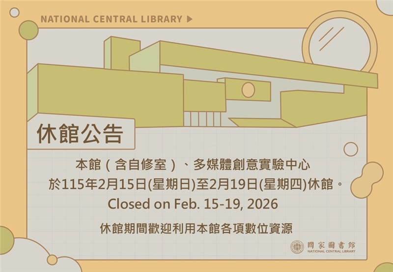 正常開館,休館期間歡迎使用數位資源,敬祝 新春愉快!】