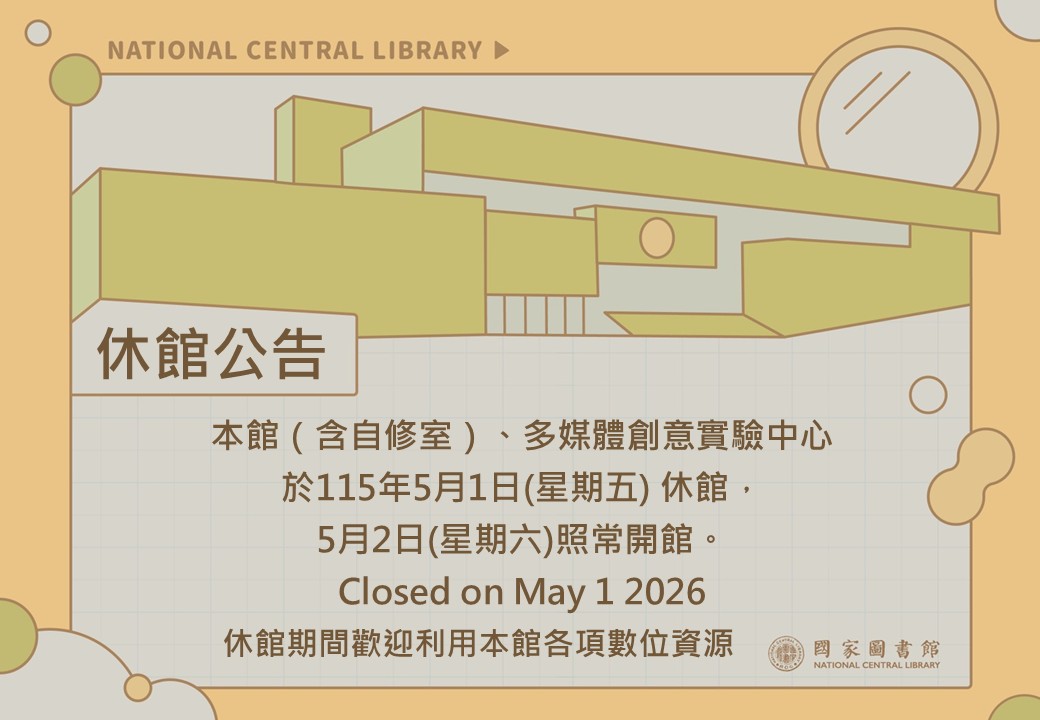 本館(含自修室)、多媒體創意實驗中心於115年5月1日(星期五) 休館,5月2日(星期六)照常開館。