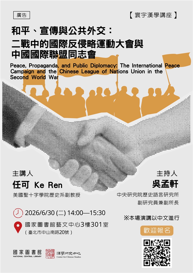 講題:和平、宣傳與公共外交:二戰中的國際反侵略運動大會與中國國際聯盟同志會(Peace, Propaganda, and Public Diplomacy: The International Peace Campaign and the Chinese League of Nations Union in the Second World War)