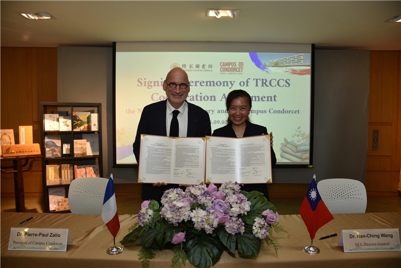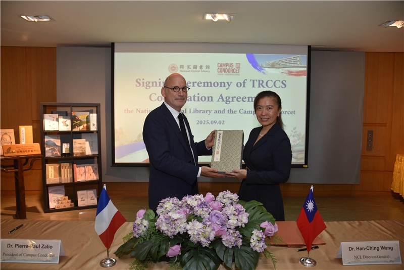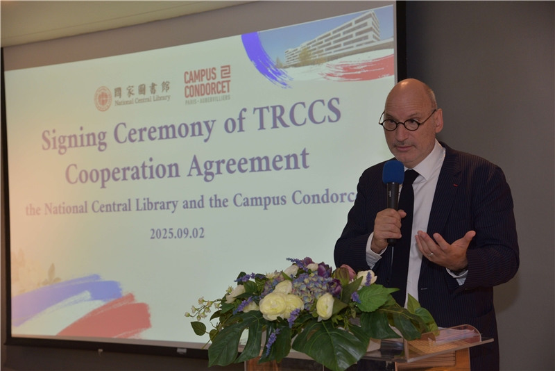 臺法交流持續深化,國家圖書館(以下簡稱國圖)於本(114)年9月2日,與國際級人文社會科學研究重鎮法國孔多塞校園(Campus Condorcet)正式簽署合作協議,於其人文社會圖書館(Humathèque Condorcet)設立「臺灣漢學資源中心」(Taiwan Resource Center for Chinese Studies, 以下簡稱TRCCS)。此次簽署儀式,不僅為國圖在全球漢學資源布局再添生力軍,更象徵臺法兩國在圖書及人文社會科學領域的合作邁向新的里程碑。