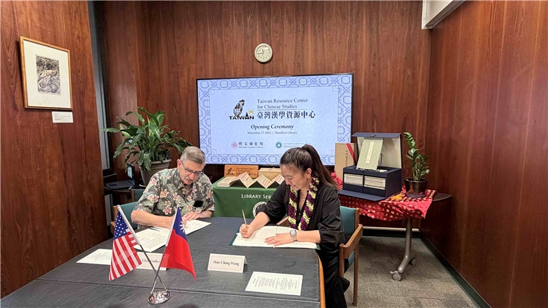 為深化臺美學術交流,國家圖書館(以下簡稱國圖)於2025年11月17日,與美國夏威夷最具代表性之研究型大學——夏威夷大學馬諾亞分校(University of Hawaiʻi at Mānoa, 以下簡稱UHM)正式簽署合作協議,於總圖書館(Hamilton Library)設立「臺灣漢學資源中心」(Taiwan Resource Center for Chinese Studies, 以下簡稱TRCCS),並簽署加入國圖建置的「中文古籍聯合目錄備忘錄」協議。此次合作,不僅將臺灣優質學術資源推向太平洋的樞紐,以及UHM中文古籍資源能夠與全世界共享,更象徵著兩館在圖書文化交流及學術研究領域的夥伴關係邁向新的里程碑。